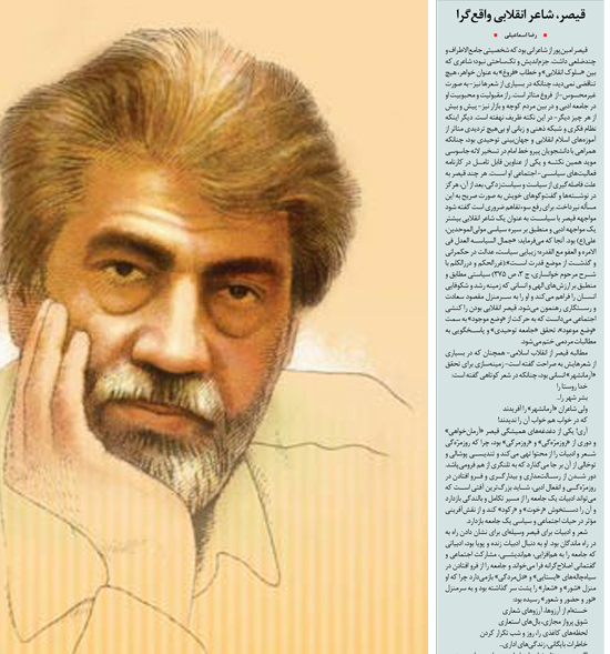 اگر به مرور تاریخ ادبیات ایران و جهان بپردازیم، متوجه خواهیم شد مسیر حرکت ادبیات یک کشور، از نقطه «آرمانگرایی» آغاز و پس از عبور از منزل «واقعگرایی»، در بستر ناکامیهای اجتماعی، به نقطه روزمرّهگی ختم میشود. در واقع، اگر ادبیات کشوری بعد از گذر از منزل «آرمانخواهی»، در دایره «واقعگرایی» که نقطه اعتدال است به حرکت خود ادامه دهد، دچار روزمرّهگی نمیشود اما عموماً بحرانها و ناکامیهای سیاسی- اجتماعی، آن را از دایره «واقعگرایی» و اعتدال منحرف و دچار روزمرّهگی میکند. قیصر اما از آن دسته شاعرانی بود که با گره زدن «آرمانخواهی» و «واقعگرایی»، بعد از بحران سیاسی پذیرش قطعنامه- بهرغم بسیاری از شاعران که فکر میکردند دنیا به آخر رسیده است- ناامید نشد و با هوشمندی انقلابی همچنان به رفتن ادامه داد، چنانکه خود در دیداری که با بعضی از شاعران در اواخر عمر داشته با صراحت بر «صداقت انقلابی» خویش پای میفشارد و میگوید: «الحمدلله برخلاف افرادی که رفیق نیمهراه هستند و میگویند ما برخی شعرها را نگفتیم و انگار توبه کردند از انجام برخی کارهایشان در گذشته، ما این گونه نیستیم و لااقل در آن لحظهای که شعرها را گفتیم صداقت داشتیم، چون الحمدلله نه برای سکه بود و نه برای تکهای زمین».